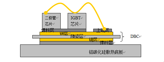 IGBT模塊一般由IGBT芯片、二極管芯片、焊料、DBC基板、鍵合引線、散熱底板、外殼等按照工藝文件封裝而成。在IGBT模塊進行外殼封裝之前,先將IGBT芯片和二極管芯片通過焊片將其焊接在DBC基板上,其次,將焊好芯片的DBC進行芯片鍵合,然后再進行二次焊接和超聲波檢測。
