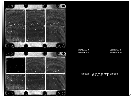 對這兩組不同的模塊進行超聲波檢查掃描圖像,將掃描圖載入空洞統計分析軟件,計算出每個DBC板焊接區域的焊接空洞占整個焊接表面的百分比率(Window area data)及每個子單元焊接面積的最大空洞面積占該子單元焊接總面積的百分比率(Largest void data)。需要在相同的實驗條件下進行多次試驗進行對比分析。