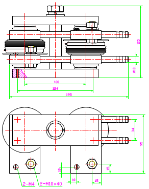 主要技術(shù)參數(shù):該組件的通流能力及斷態(tài)耐 壓,決定于所選用的晶閘管及水冷散熱器。例如:下圖所示由兩只KP800-16晶閘管及水冷散熱器組成的組件,技術(shù)參數(shù)為: